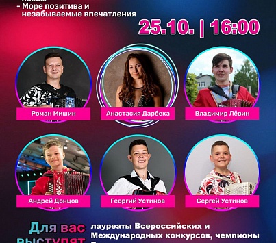 Для вас выступят лауреаты Всероссийских и Международных конкурсов, чемпионы России по гармони.