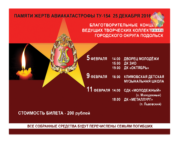 Все собранные средства будут перечислены семьям погибших в авиакатастрофе ТУ-154 в Сочи. На борту самолета погибло 92 человека, большая часть из которых – 64 человека - артисты ансамбля песни и пляски имени Александрова. Погиб цвет коллектива, который являлся мировым брендом, символом нашей страны, эталоном вокальной школы. Ансамбль был частым гостем в Подольске, а в последний раз он выступил на концерте в честь 75-летия Битвы за Москву.