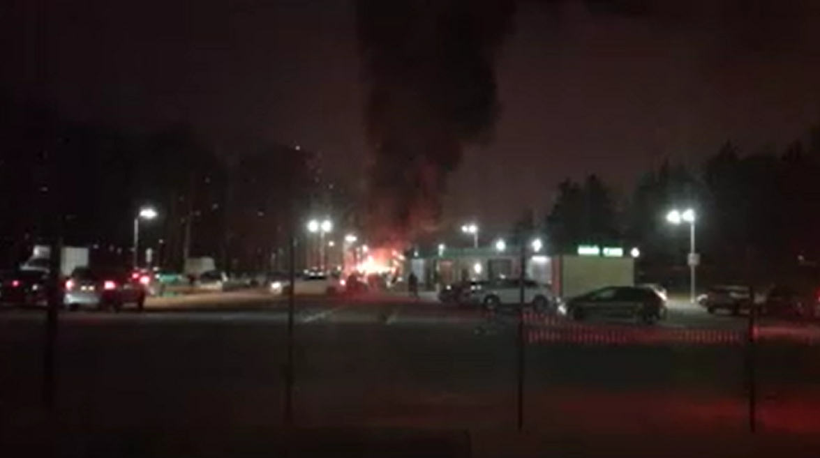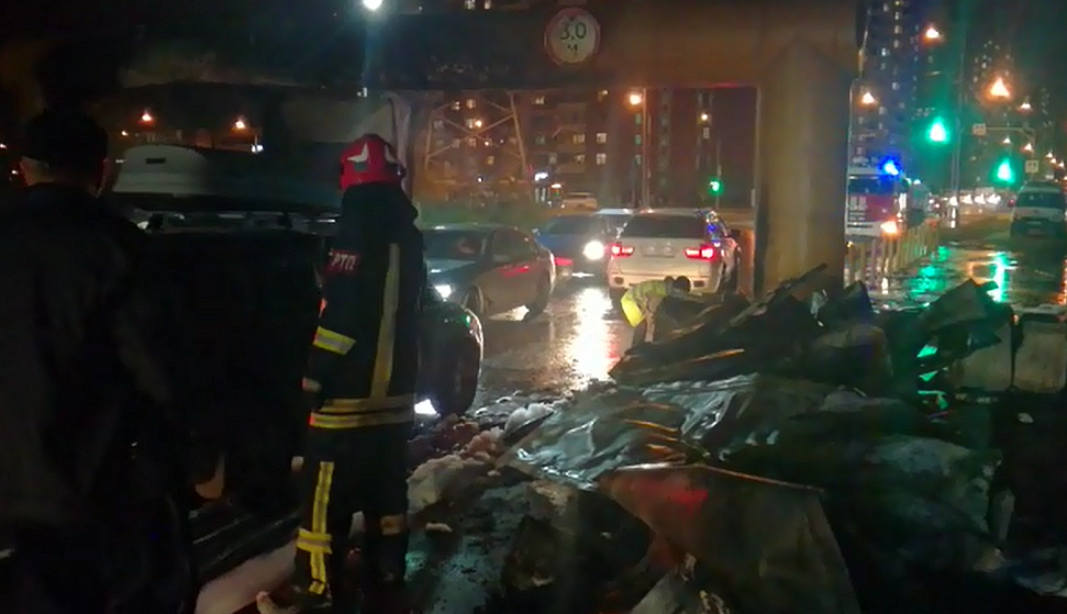 На Щербинке произошло ЧП. Грузовое авто не смогло проехать под металлической трубой, протаранив ее, и загорелось, сообщил очевидец происшествия. На месте работают спасатели.