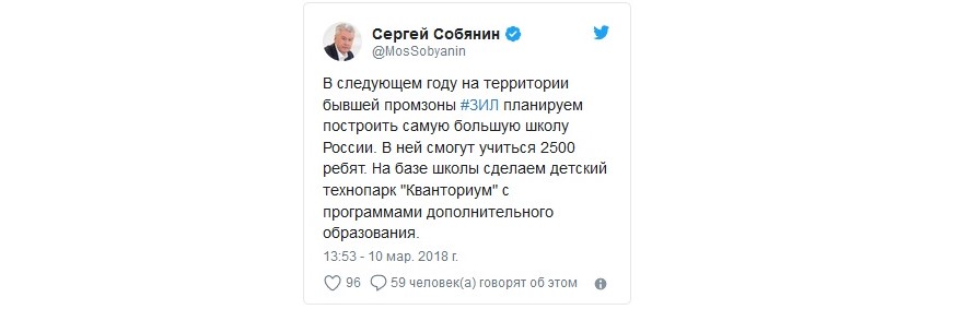 «В следующем году на территории бывшей промзоны #ЗИЛ планируем построить самую большую школу России. В ней смогут учиться 2500 ребят. На базе школы сделаем детский технопарк "Кванториум" с программами дополнительного образования», - написал столичный градоначальник.