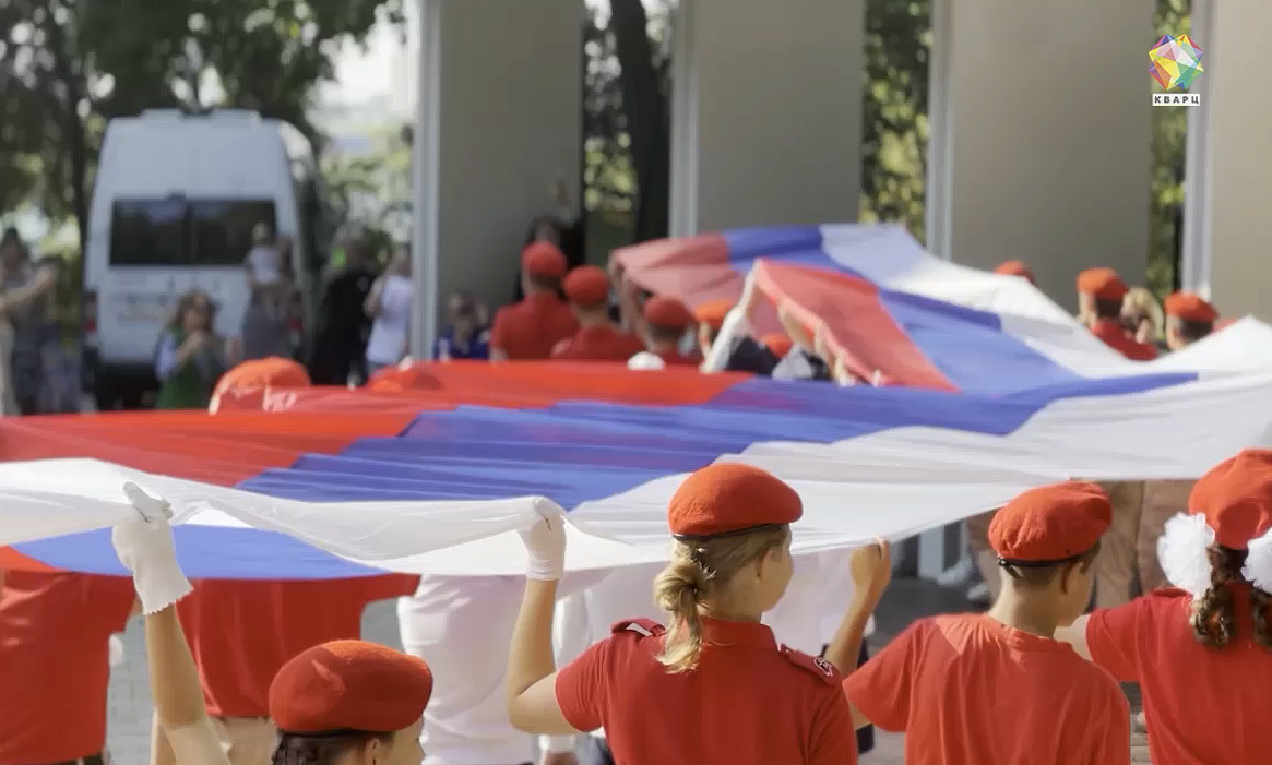 Концерт в городском парке - это кульминация всех сегодняшних мероприятий. Самый большой стяг - размером в одну тысячу квадратных метров - развернули в детско-юношеском центре "Родина". Более двухсот детей приняли участие в патриотической акции.