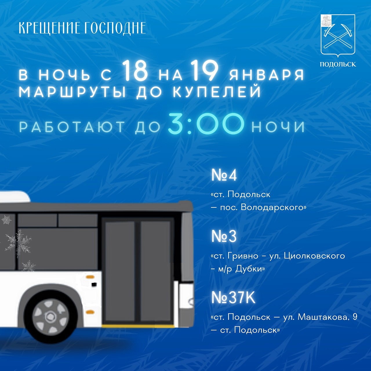 В Подольске работа общественного транспорта в Крещенскую ночь с 18 по 19 января будет продлена до 03:00/ Как сообщает