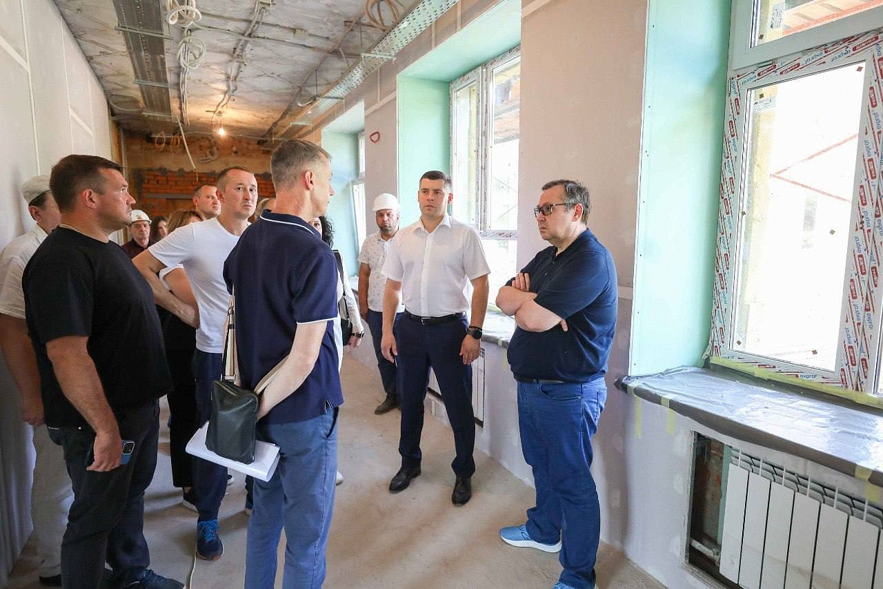 Вице-губернатор Игорь Тресков, министр строительства Владимир Локтев и глава Подольска Григорий Артамонов проверили ход ремонта в 4 Гимназии