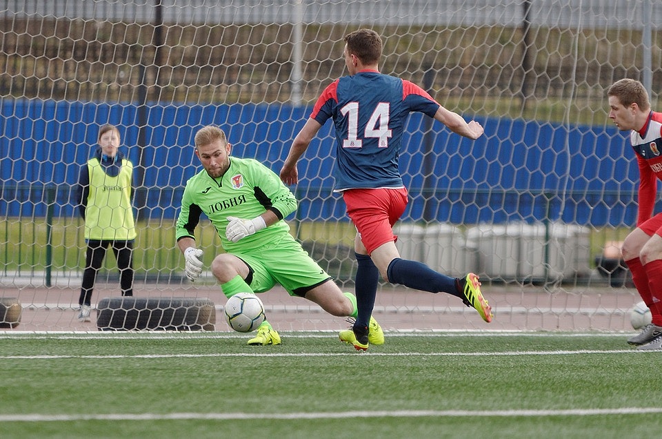 "Витязь" создает острые моменты у ворот соперника, защита противника играет четко, вратарь стоит уверенно. После очередного удара Александра Масленникова голкипер "Лобни" снова спасает ворота. А такой был бы красивый гол!