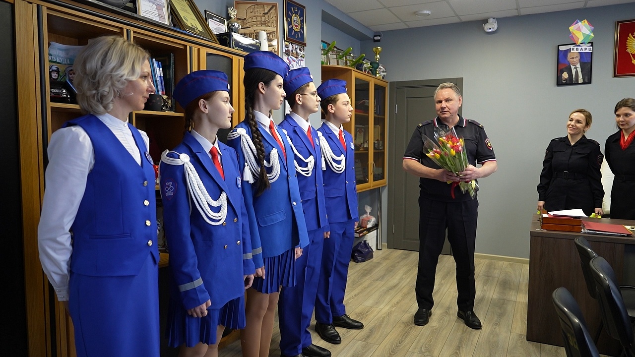 В Госавтоинспекции Подольска сегодня самые почётные гости – команда ЮИД гимназии №7 во главе со своим руководителем Татьяной Молчановой. В лице лучшего отряда нашего округа поздравления по случаю дня рождения движения прозвучат в адрес всех ребят, но сначала – цветы для девушек.