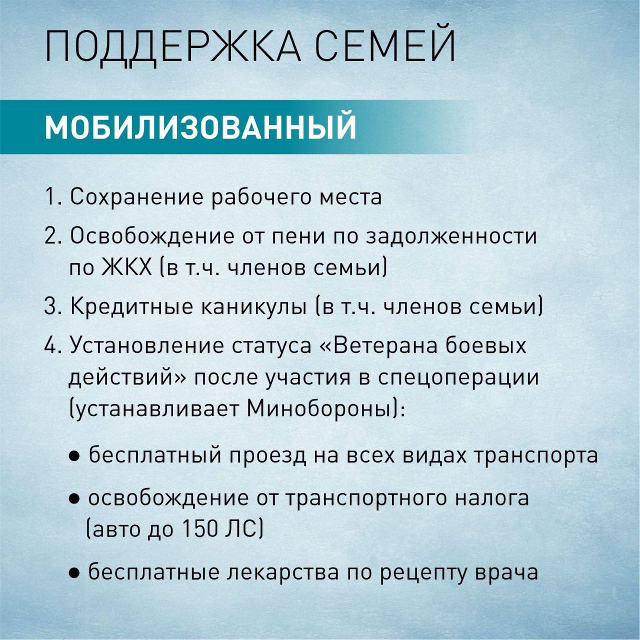 получение статуса «Ветеран боевых действий» после участия в спецоперации (устанавливает Минобороны).