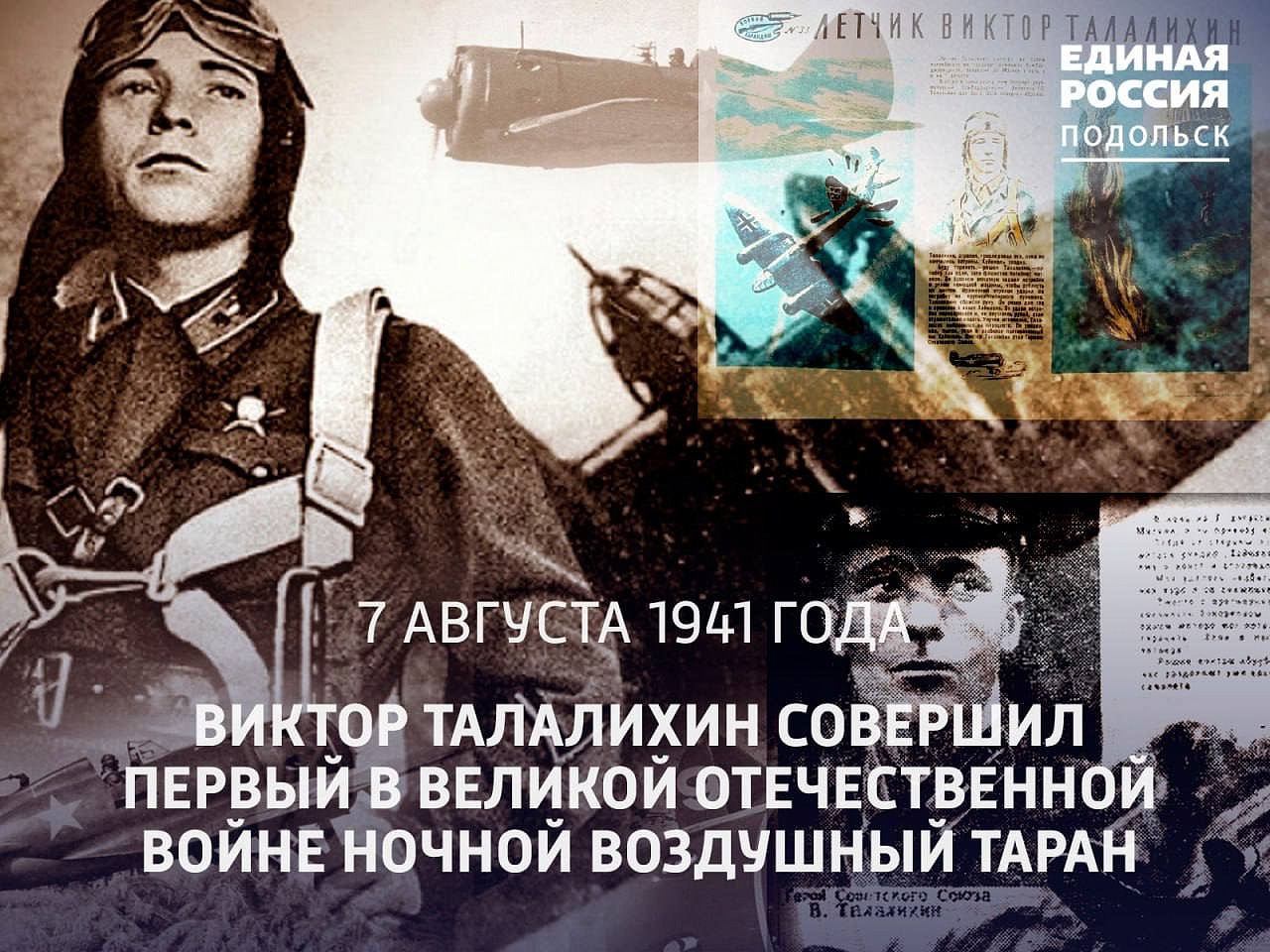 Легендарный летчик на истребителе И-16 сел на хвост «Хейнкелю -111». Враг открыл пулеметный огонь и серьёзно ранил офицера. Талалихин не просто не отступил, а протаранил самолет противника, рискуя собственной жизнью. Он врезался в хвост бомбардировщику и сумел выпрыгнуть с парашютом из горящей машины. 8 августа 1941 года за этот подвиг ему присвоили звание Героя Советского Союза. На тот момент бесстрашному Талалихину было только 22 года и в дальнейшем он еще не один раз отличался во время боевых действий в воздухе. Погиб летчик 27 октября 1941 года во время очередного вылета в возрасте 23 лет.
