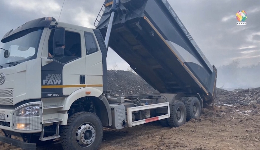 Одна за другой на полигон вблизи деревни Лучинское прибывают машины с грунтом. Здесь же продолжают работу пожарные расчеты. Возгорание было локализовано в первые сутки, сейчас очаги тления засыпают землей.