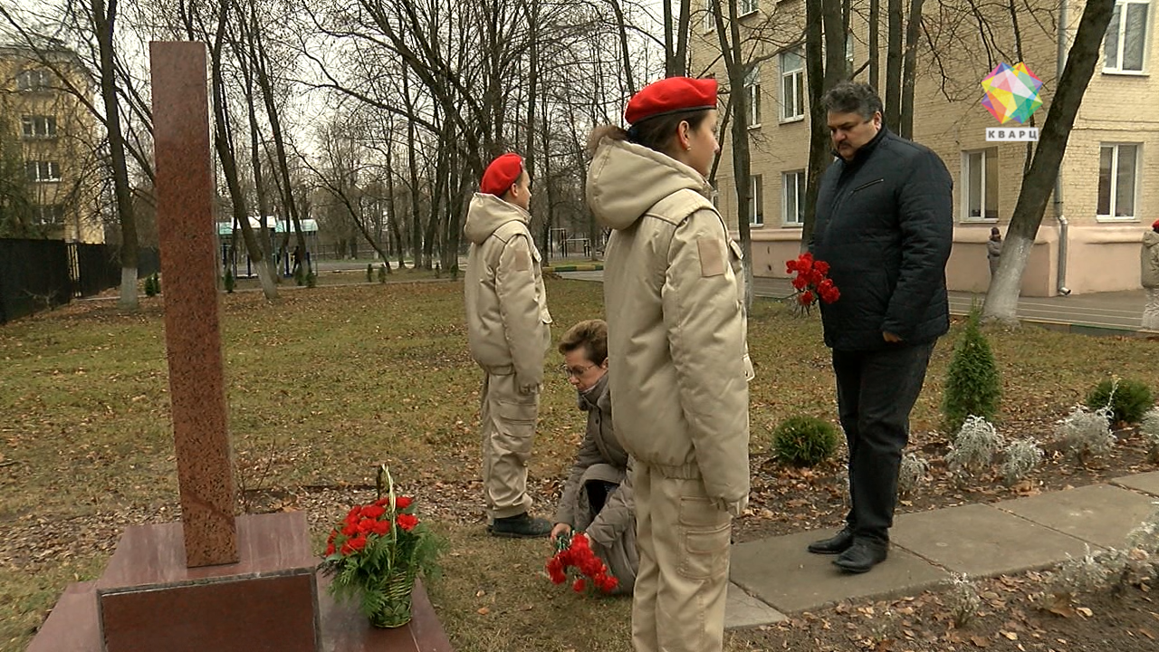 Ребята возлагают цветы к стеле, установленной на территории школы. Еще в советское время учреждение носило имя «28 героев-панфиловцев», поэтому сегодняшняя дата для учеников этой школы - особенно памятная.