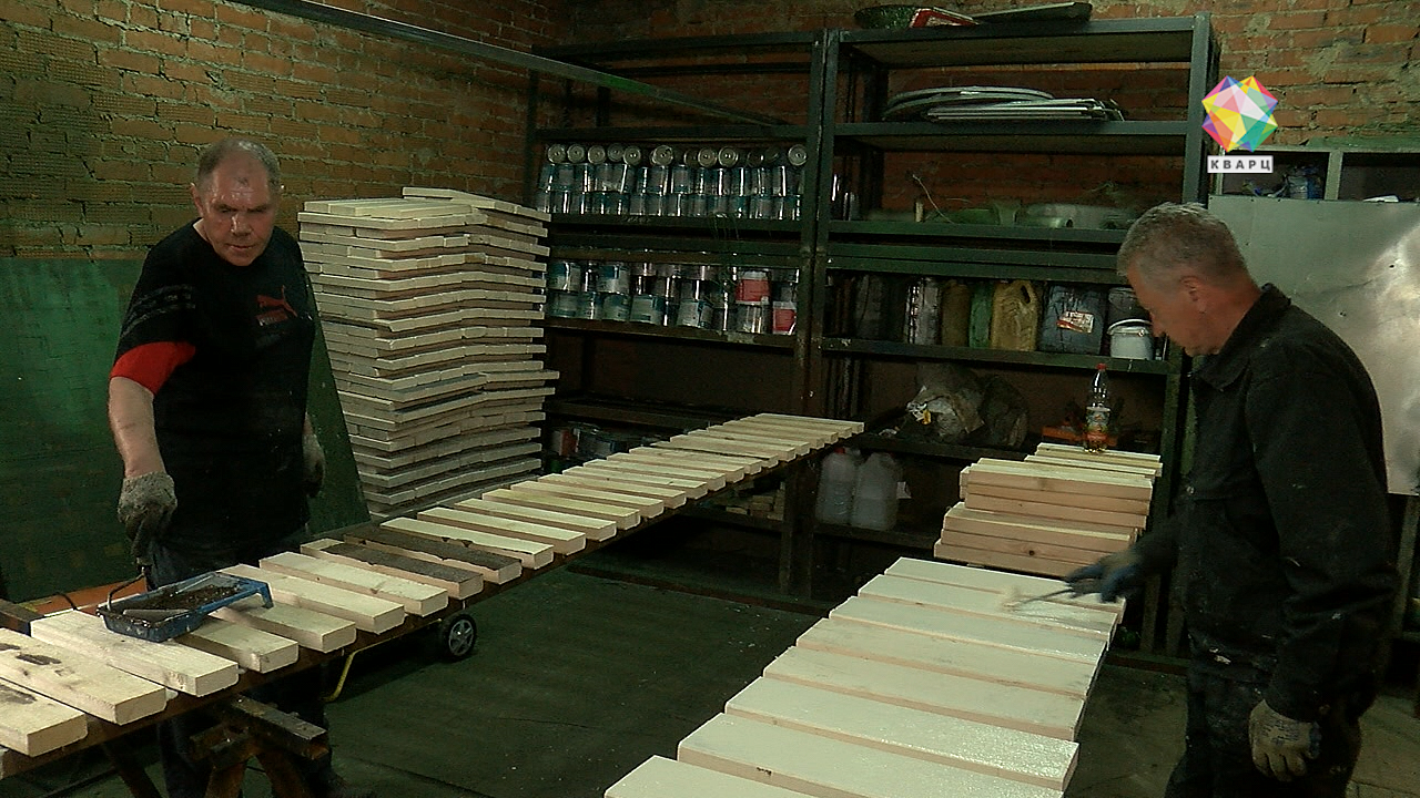 Раз дощечка, два дощечка будет лавочка. После покраски сушка, затем установка. На производственной базе Подольского комбината благоустройства ремонтируют и создают новые скамейки, лежаки и металлические ограждения, которые впоследствии установят в Большом Подольске. Первый на очереди - сквер Поколений.